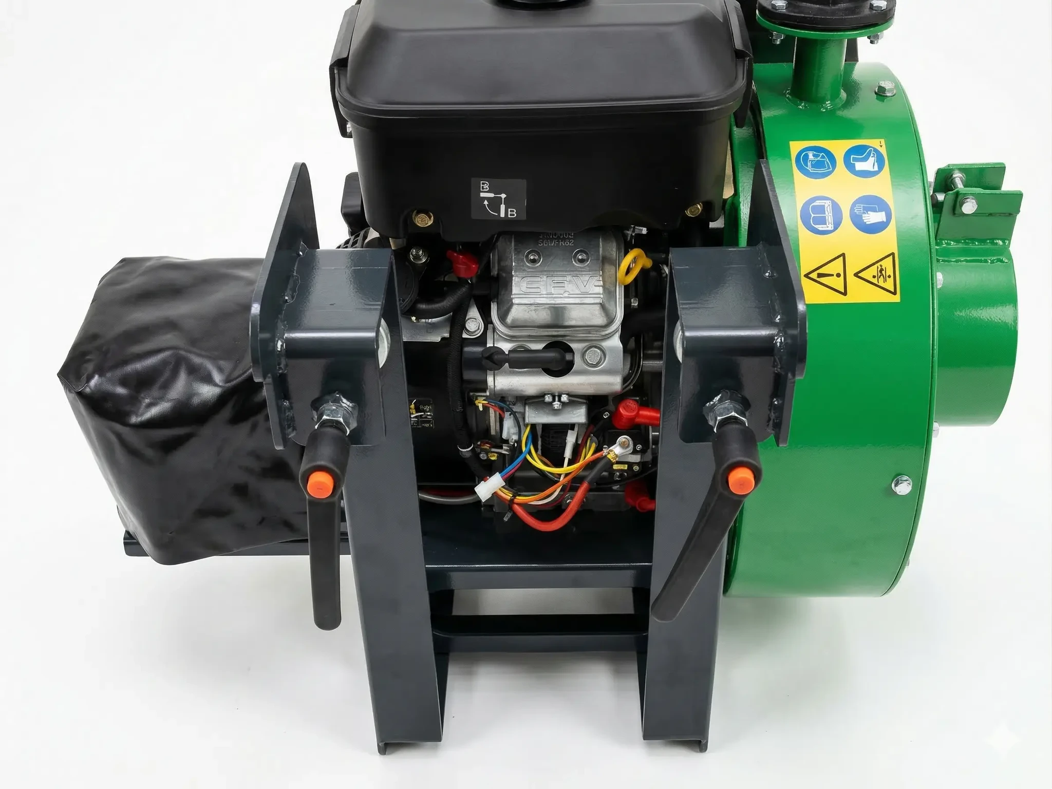 Sauger/Häcksler für die Kommunalverwaltung zur Müllbeseitigung auf Straßen und Plätzen sowie in Parks. Es können Gras, Laub, Zweige, Zapfen, Eicheln, Plastikverpackungen und -flaschen usw. in einem Anhänger gesammelt werden. Der Sauger kann mühelos an das Mähdeck eines Traktors angeschlossen werden und während der Fahrt Laub, Gras, Kunststoffverpackungen und -flaschen sowie andere Abfälle aufnehmen. Wenn Sie Laub von einer Schwade oder einem Haufen aufsaugen möchten, können Sie das erforderliche Handstück, an dem ein Rad befestigt ist, am Ende des Saugrohrs befestigen, was die Handhabung erleichtert.