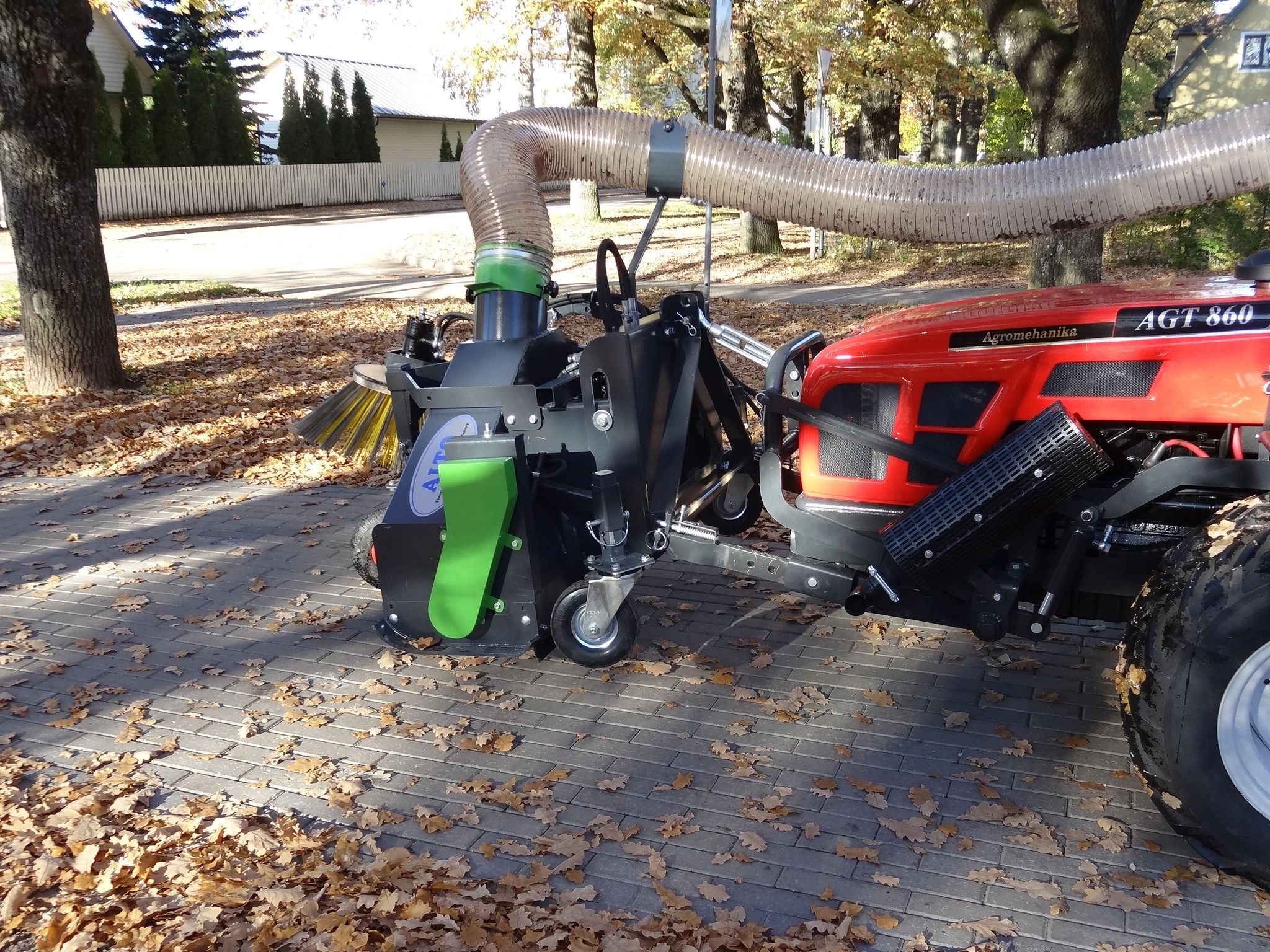 Die Saugöffnung ist für die Verwendung mit einem Laubsauger ausgelegt. Bei gemeinsamer Verwendung bieten sie die Möglichkeit, Rasenflächen, Straßen, Wege und Plätze schnell und effizient von Laub und losem Gras zu befreien. Die Saugöffnung wird an der Aufhängung vor dem Traktor befestigt und über einen Schlauch mit dem Sauger an der Kupplung oder der Anhängerdeichsel an der Rückseite des Traktors verbunden. Die Saugöffnung ist mit einer hydraulischen rotierenden Bürste ausgestattet, die auch am Boden haftendes Laub sammelt. Die Bürste wird von einem Hydraulikmotor angetrieben. Die Saugöffnung/Bürste an der Kupplungsdeichsel verfügt über ein bewegliches Nachlaufsystem. Für eine effektive Reinigung verschiedener Flächen ist es notwendig, die Höhe der Bürste vom Boden aus einstellen zu können. Dazu bietet unsere Saugöffnung/Bürste die Möglichkeit, die Stützräder nach oben und unten, die Fußrasten rechts und links am Gehäuse und die vordere Schürze zu verstellen. Ein geringer Wartungsaufwand erleichtert die Instandhaltung dieses Geräts. Seitenbürste mit einer Arbeitsbreite von 600 mm. Die Drehzahl der Saugbürste ist einstellbar. Die Seitenbürste an der Saugöffnung kann separat ein- und ausgeschaltet und ihre Drehzahl eingestellt werden.